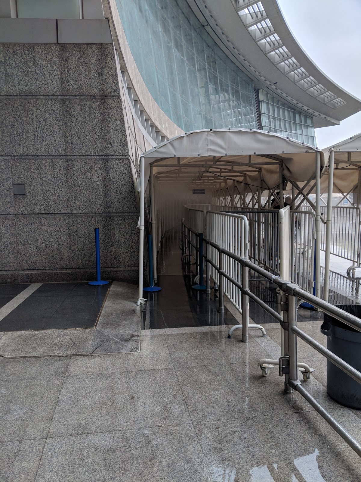 Now, this particular day was super rainy, so not that many people came out to the museum. There was almost no line to speak of, and nobody was using the covered waiting area at all.